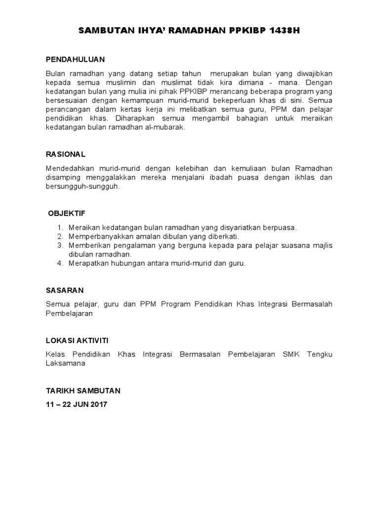 . Justeru itu program ini dirancang dan dilaksanakan dengan tujuan untuk mendapatkan keredhaan Allah dan memohon agar ibadah yang dilakukan mendapat ganjaran pahala dari Allah serta dapat memberikan kesedaran dan pengajaran dalam penghayatan Ramadhan. Contoh Kertas Kerja Program Berikut merupakan koleksi kertas kerja dan buku program ihya ramadhan yang boleh dilaksanakan di sekolah. Menanam minat murid secara berterusan dalam tilawah Al-Quran dan sentiasa mendampinginya.